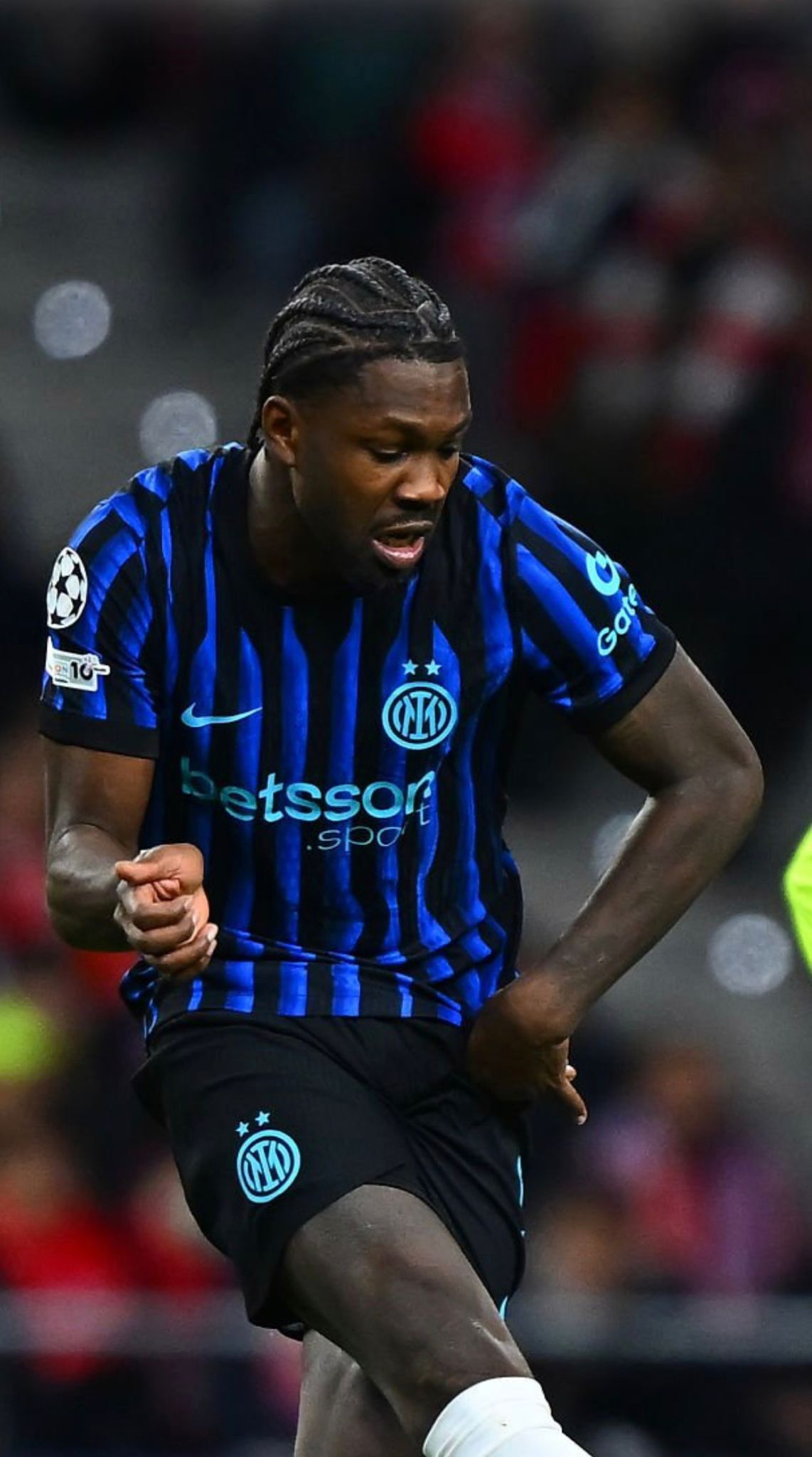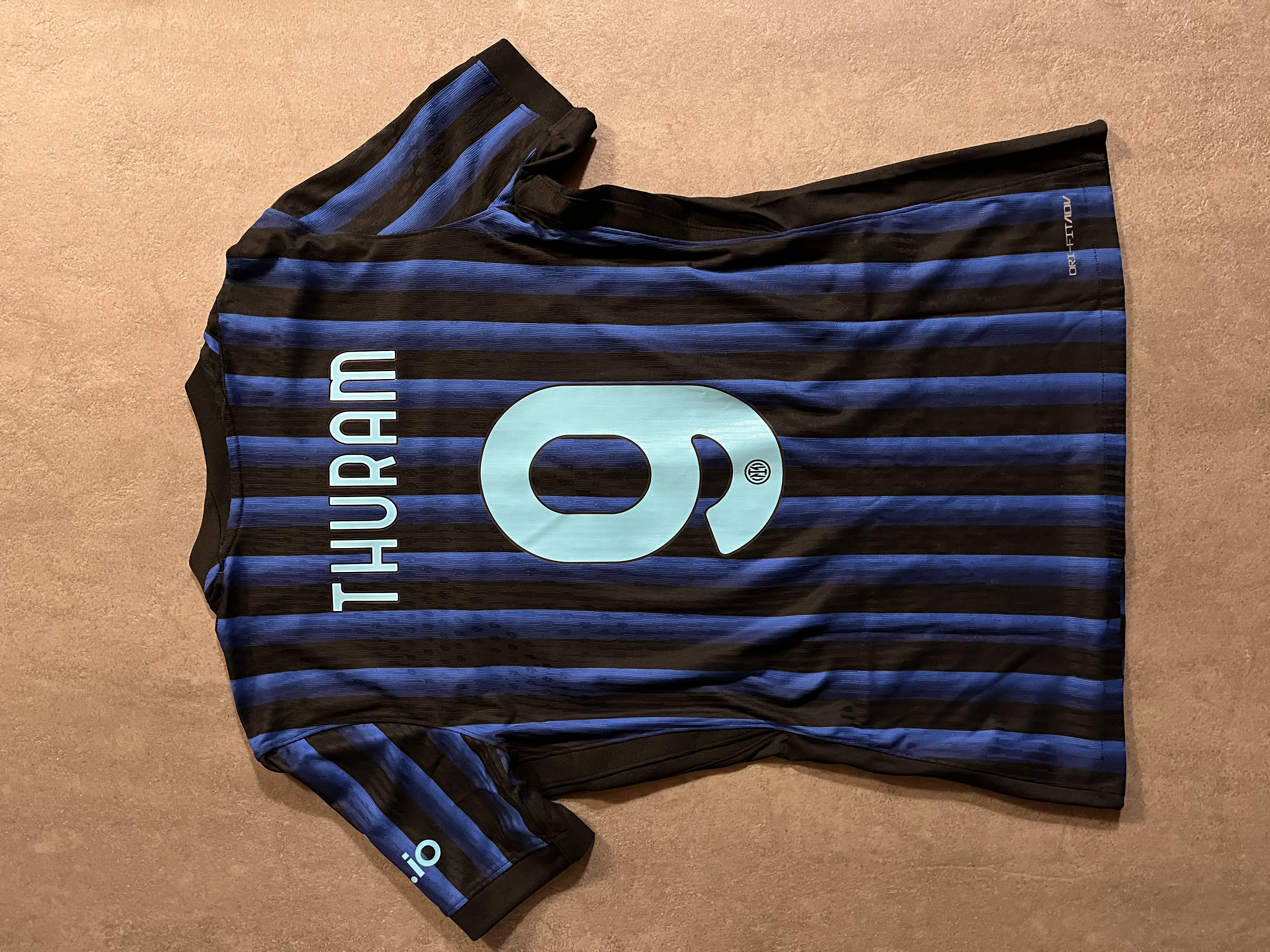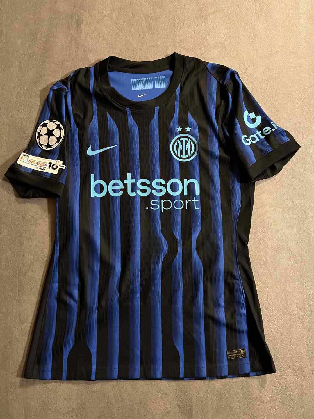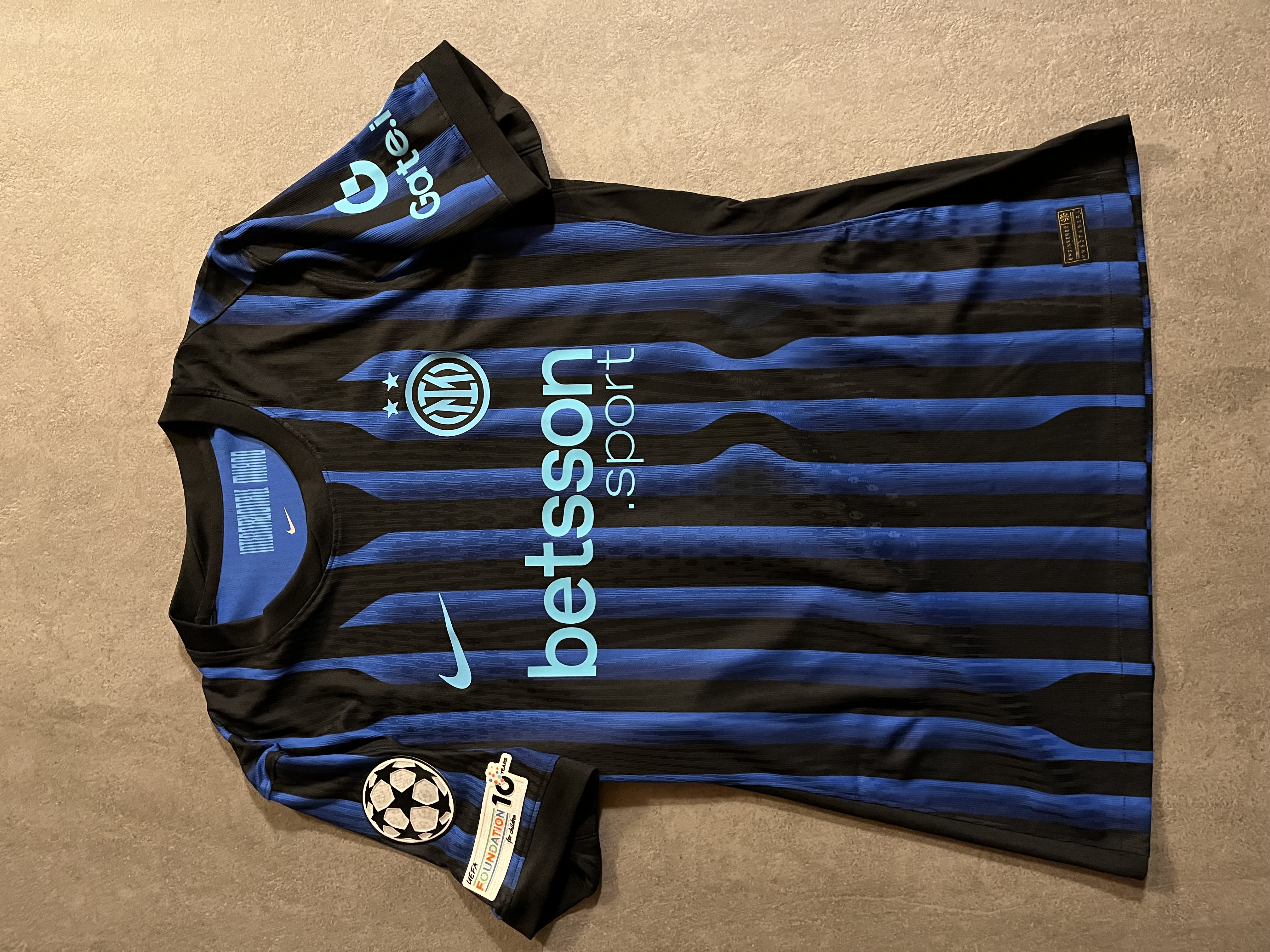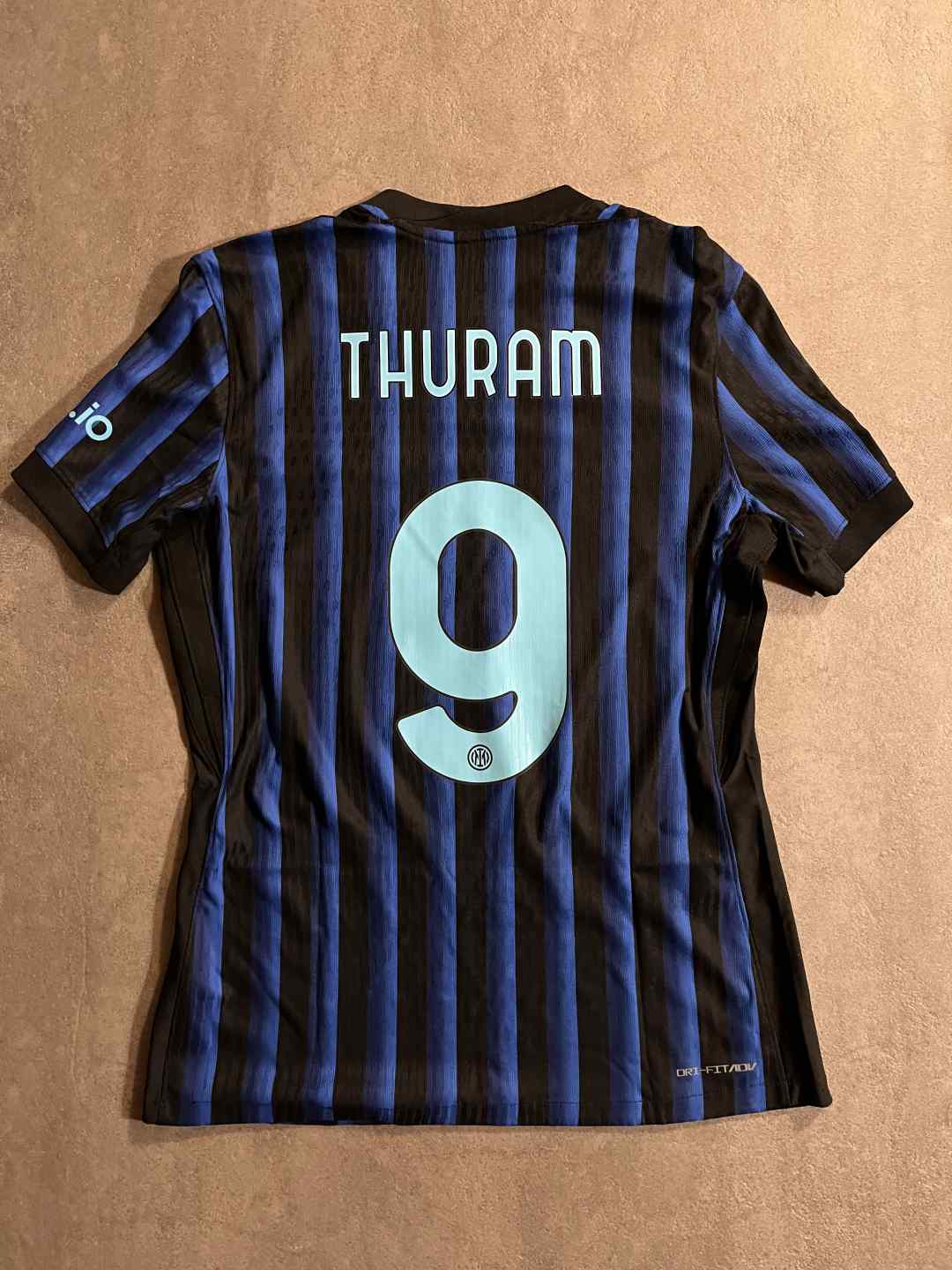 Maglia preparata per il giocatore Marcus Thuram per la gara di Champions League fra Inter e Slavia Praga. La maglia presenta tutte le caratteristiche uniche delle maglie match work ed issued e pertanto si distinguono da quelle da store per via di determinati particolari che la rendono unica quali logo Inter e Nike termo applicati, Patch Uefa Champions Leauge e Patch Uefa Foundation termo applicate sulla manica destra, retro maglia con assenza dello sponsor UPower come da normativa Uefa, l'etichetta interna di lavaggio termo applicata anziché cucita e la presenza di una piccola etichettina interna con codici Nike.
