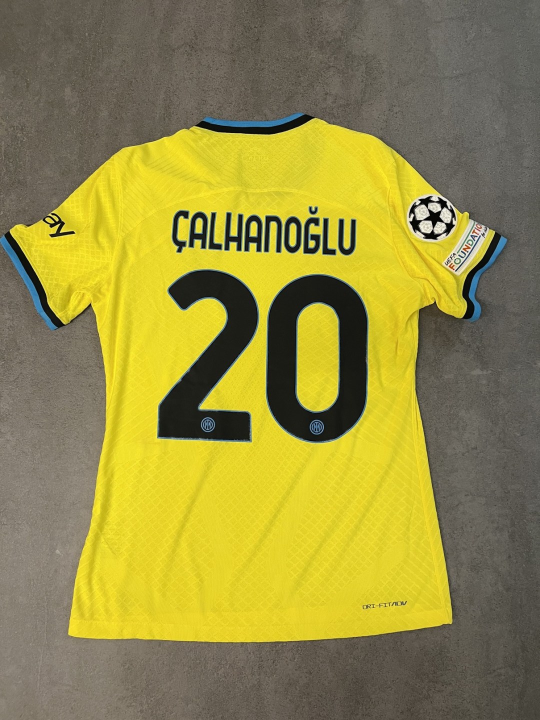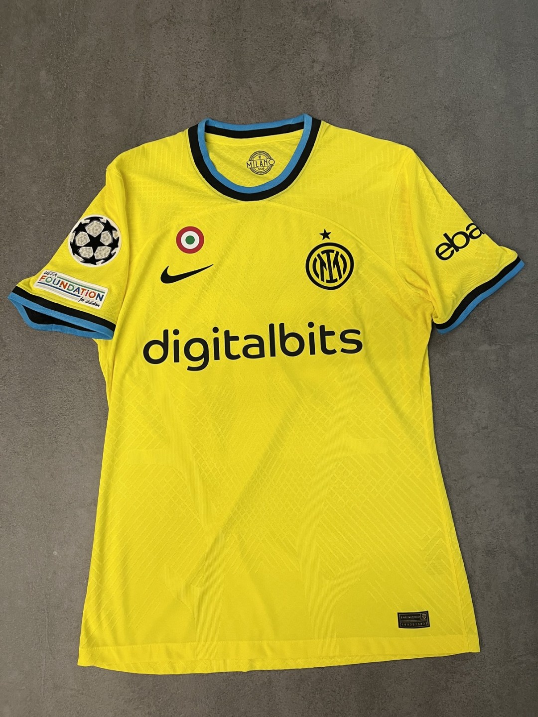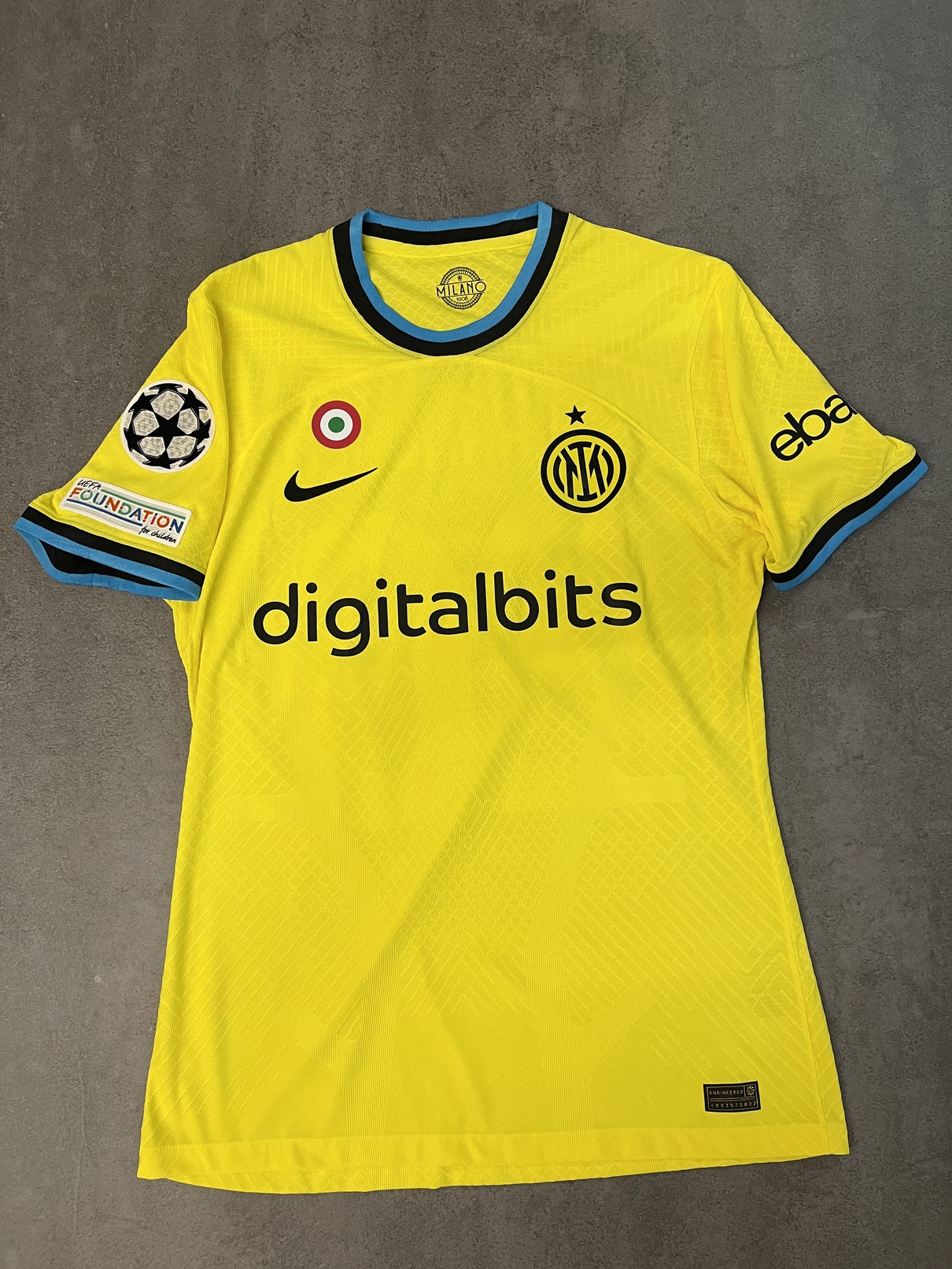 Descrizione estesa:Terza maglia Inter con patch Uefa Champions League + Foundation su manica destra e sponsor Ebay su manica sinistra, logo Inter e Swoosh Nike termo applicati, etichetta lavaggio interna termo applicata, trama maglia leggera. Assenza sul retro dello sponsor Lenovo sotto al numero in quanto non conforme alla normativa Uefa. Caratteristiche che rendono la maglia unica e differente da quelle in commercio.