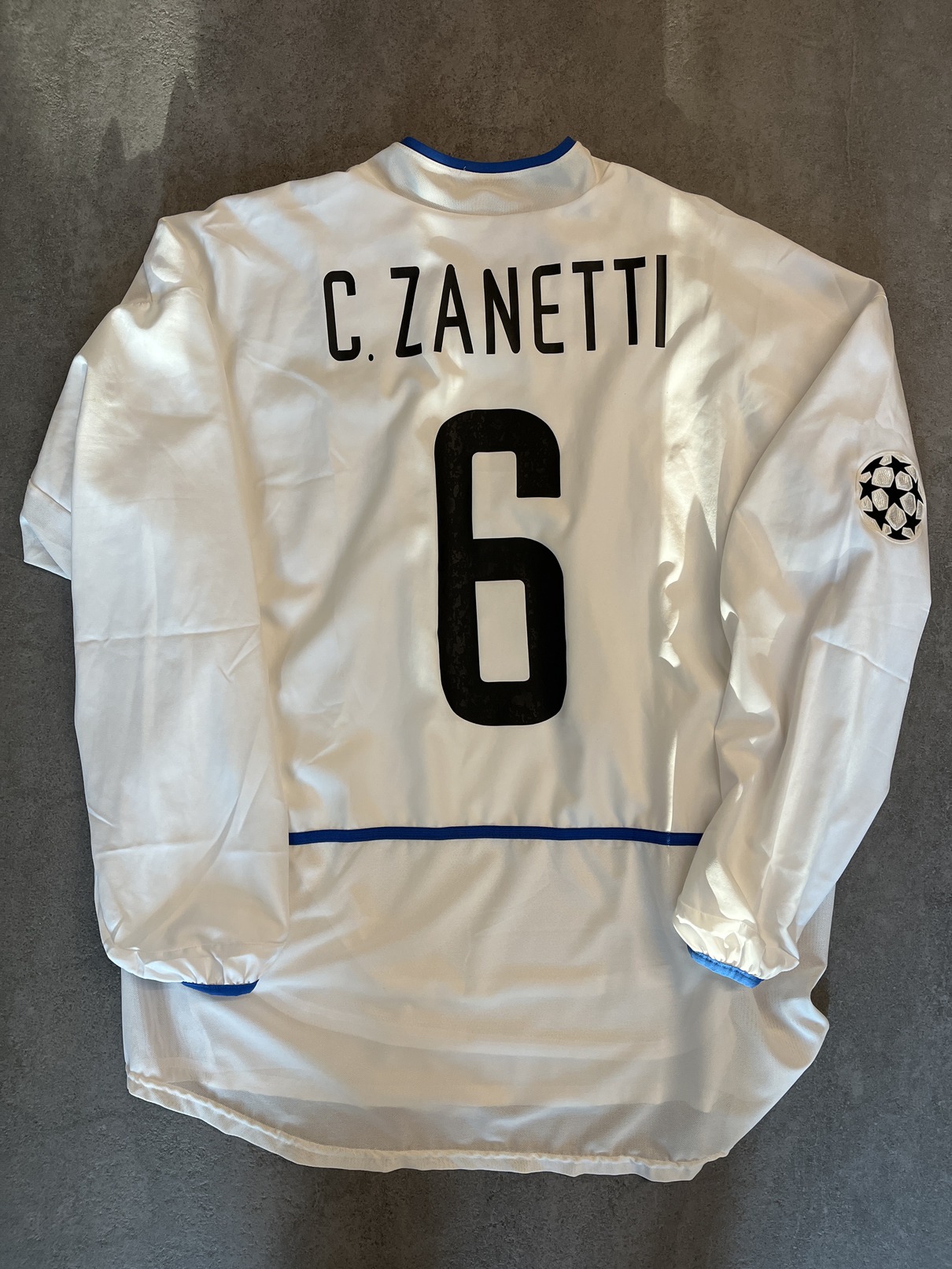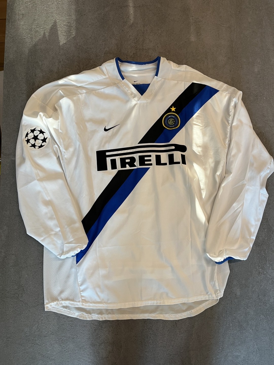 Sponsor Pirelli di velluto in rilievo, swoosh Nike cucito, scudetto Inter in plastichino e feltro cucito. Patch Uefa Champions League termoapplicata sulla manica destra. All'interno della maglia è presente un doppio strato di rete traforata.