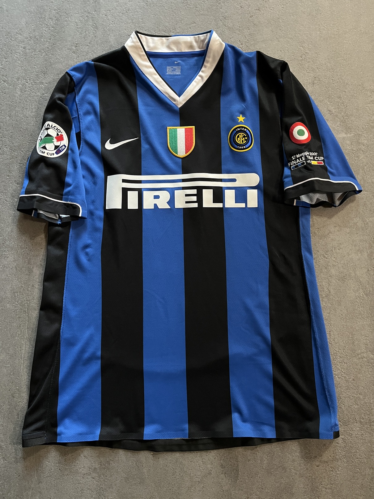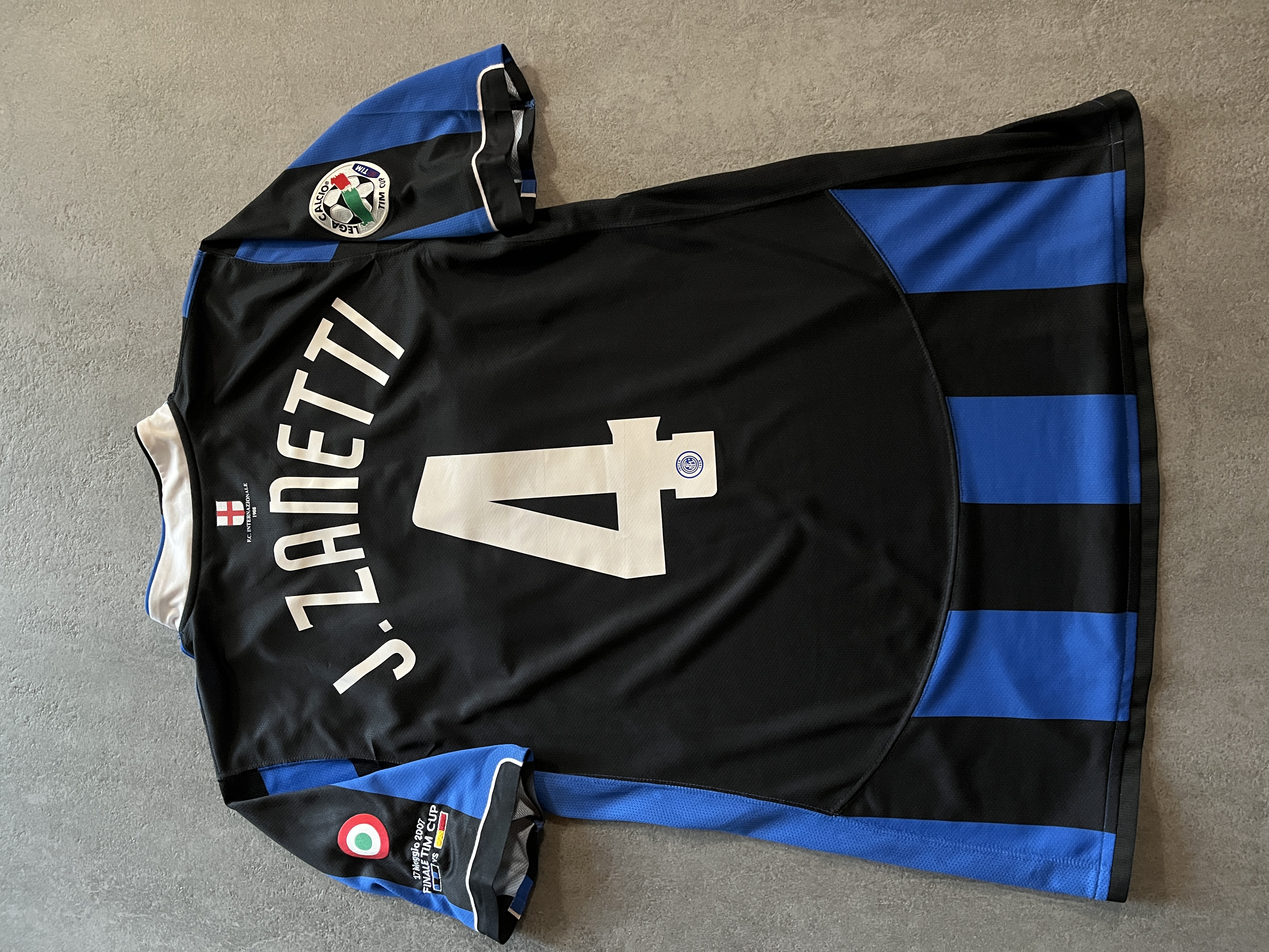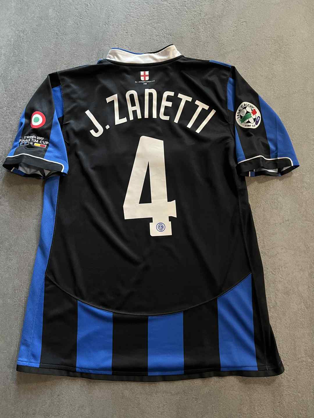 Descrizione estesa:Maglia home a mezze maniche indossata dal calciatore J. Zanetti durante la Finale di Coppa Italia fra Inter e Roma. Made in Marocco taglia L. Nome e numero ufficiale in Player Size Version a differenza delle repliche i cui materiali sono differenti e più pesanti. Patch Lega Calcio TIM CUP termo applicata su manica destra e patch coccarda detentore titolo Coppa Italia termo applicata su manica sinistra e sottostante la coccarda ricamo della finale riportante la data e i nomi delle due squadre con rispettivi colori. Scudetto termoapplicato e cucito al petto. Etichetta al collo con il solo swoosh Nike (senza la scritta DRY FIT presente nelle repliche). Assenza della scritta DRY FIT nel retro maglia (presente invece nelle repliche di quella stagione). I bordi della maglia sono tutti termo saldati (nelle repliche invece sono cuciti). Presenza di una sola etichetta piccola internamente alla maglia con data. Retro maglia come per la Champions League totalmente nero, ma senza occultamento del blasone di Milano sotto al colletto in quanto il regolamento di Coppa Italia non prevede alcuna restrizione in merito. Maglia mai commercializzata con queste caratteristiche.