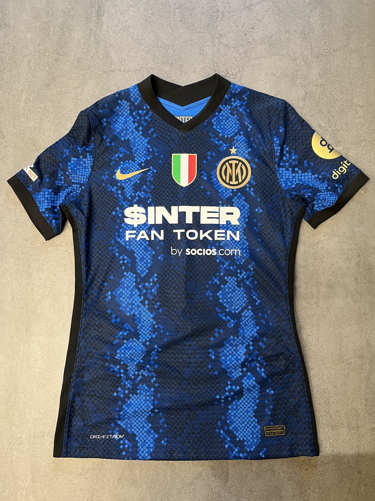 Swoosh Nike, logo Inter e scudetto termo applicati. Sul retro nome e numero in official player size e sponsor Lenovo stampato sotto al numero.