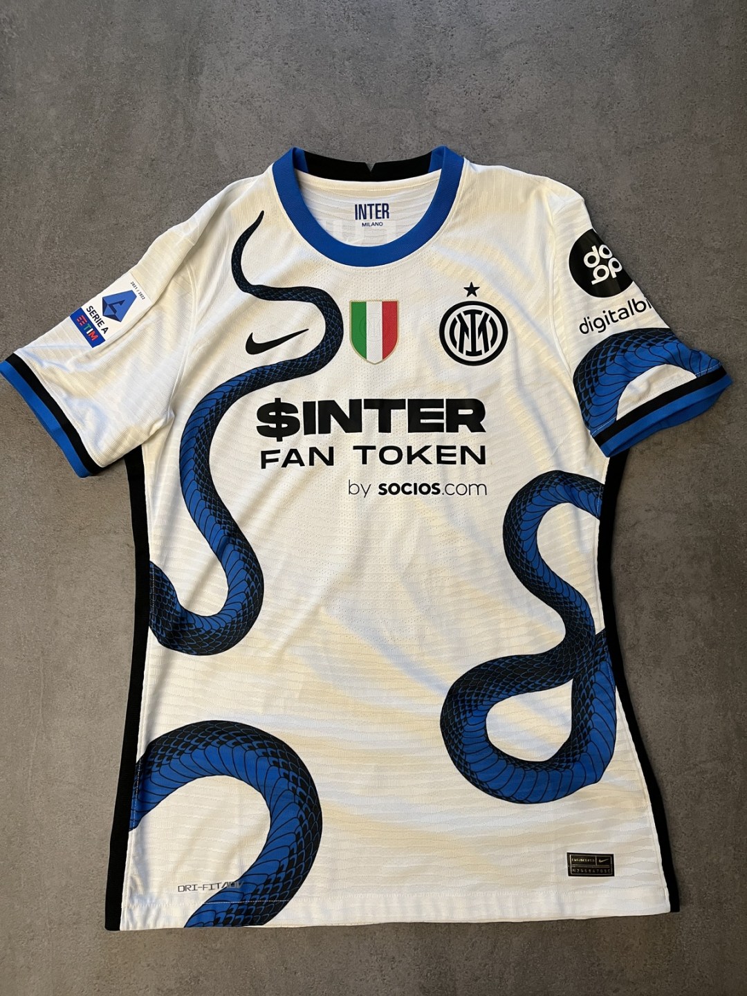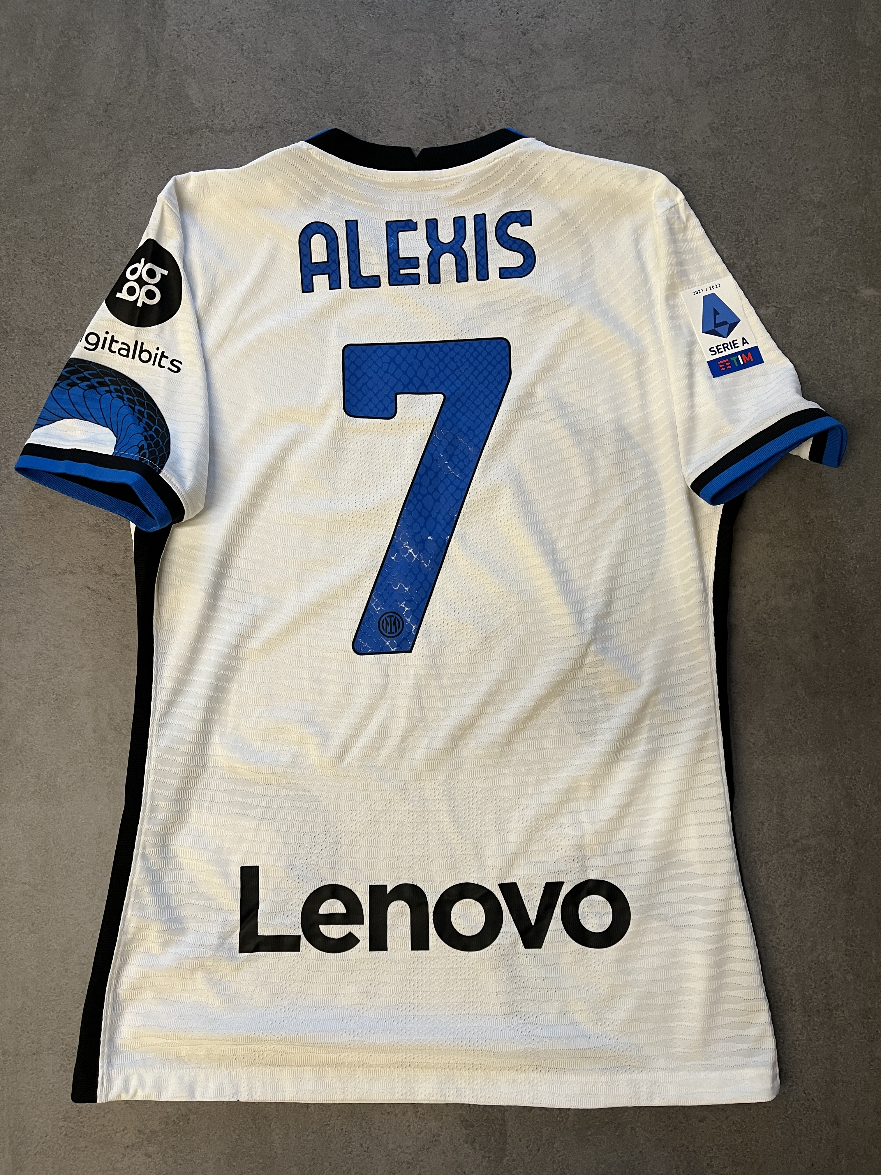 Descrizione estesa:Maglia indossata da Alexis Sanchez durante Salernitana - Inter. Taglia L made in Indonesia. Patch Serie A TIM termo applicata sulla manica destra e patch digitalbits stampato sulla manica sinistra. Swoosh Nike, logo Inter e scudetto termo applicati. Sul retro nome e numero in official player size e sponsor Lenovo stampato sotto al numero. Etichetta interna con indicazioni lavaggio termo applicata.