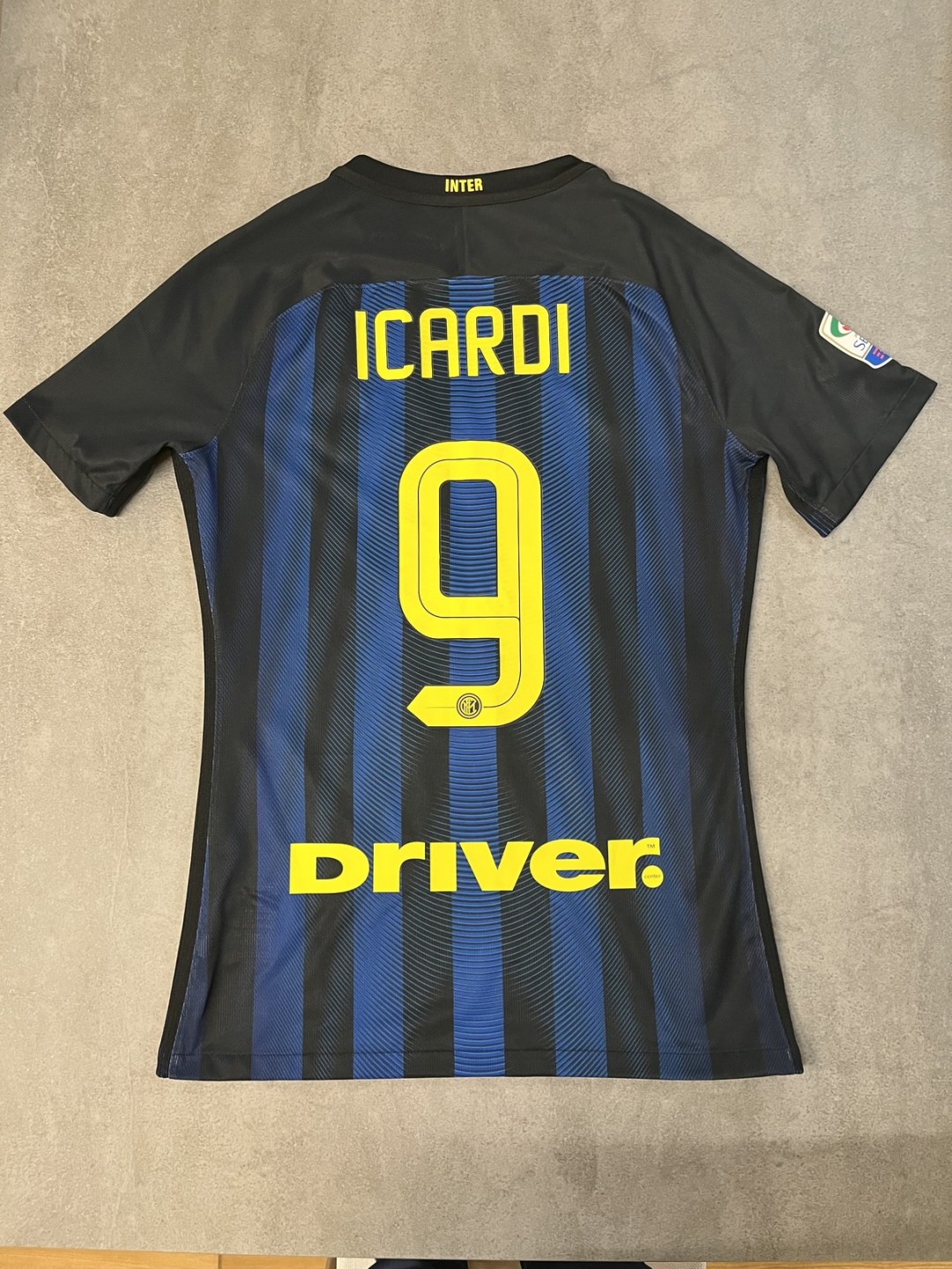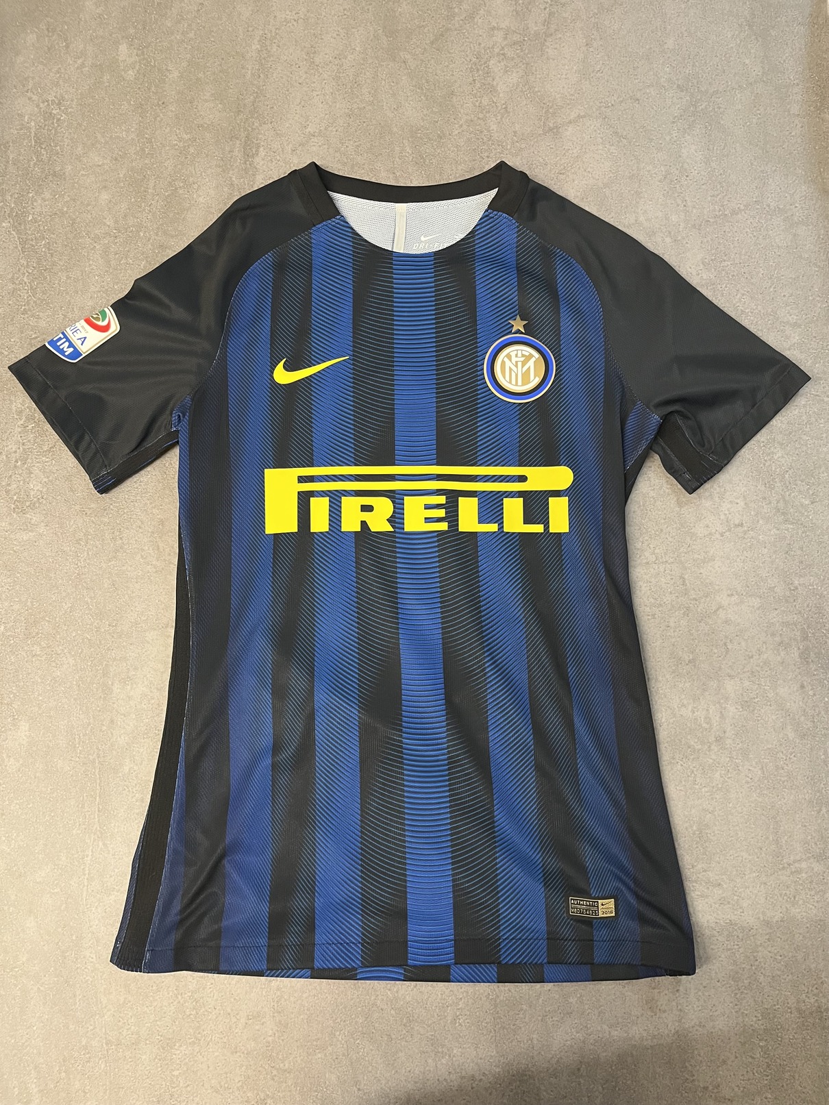 Descrizione estesa:Maglia Home con logo SERIE A TIM termo applicato sulla manica destra, sponsor PIRELLI colore giallo, numero stampato sul retro di colore giallo con la righina nera nel mezzo (assente in Europa League), sponsor Driver sul retro della maglia sotto al numero colore giallo (assente in Europa League), logo INTER e logo NIKE sul petto termo applicati (nelle repliche e maglie promo da store risultano invece ricamati), etichetta lavaggio interna termo applicata (nelle repliche e maglie promo da store è in stoffa cucita) + etichettina piccola di carta.