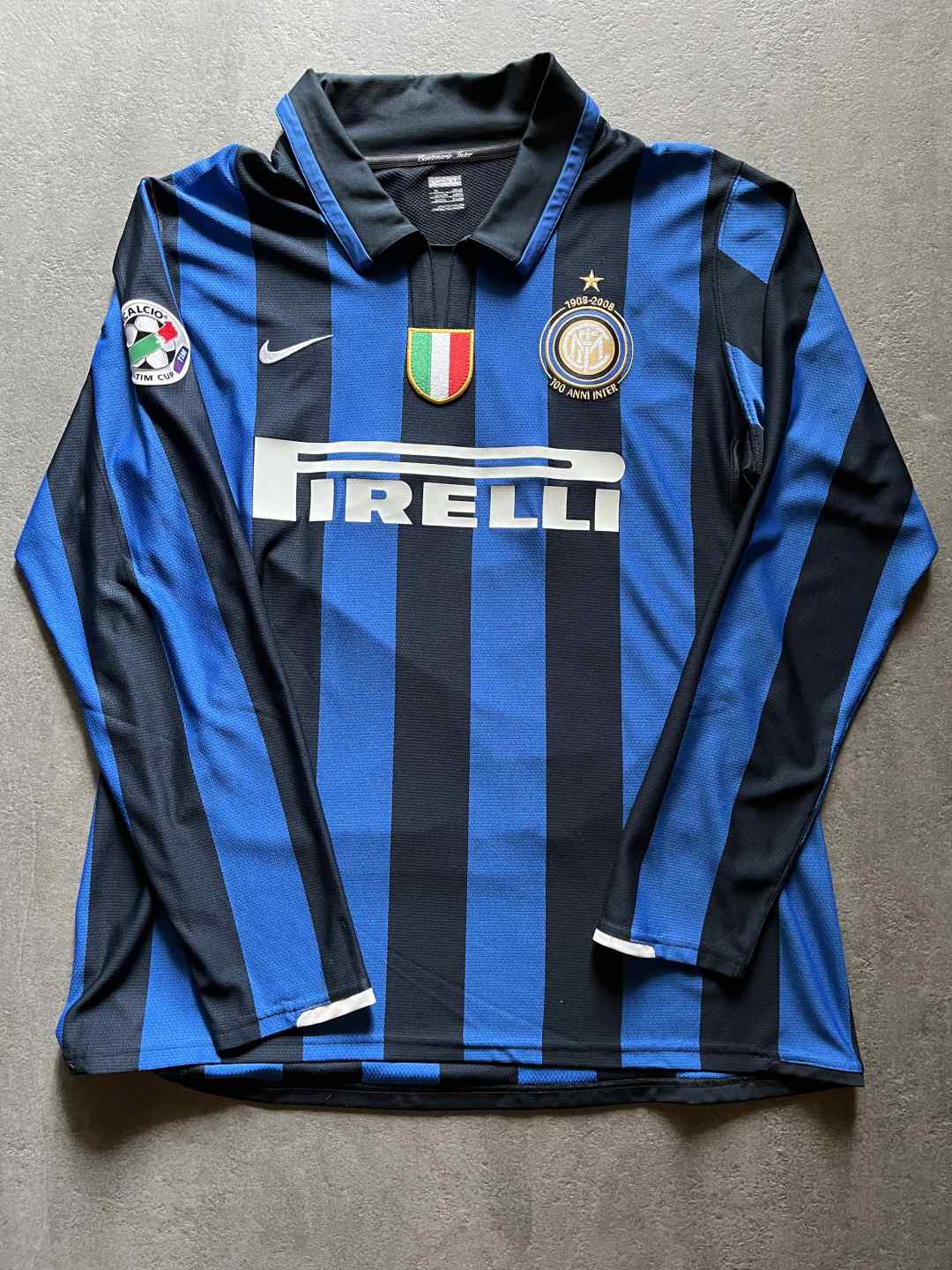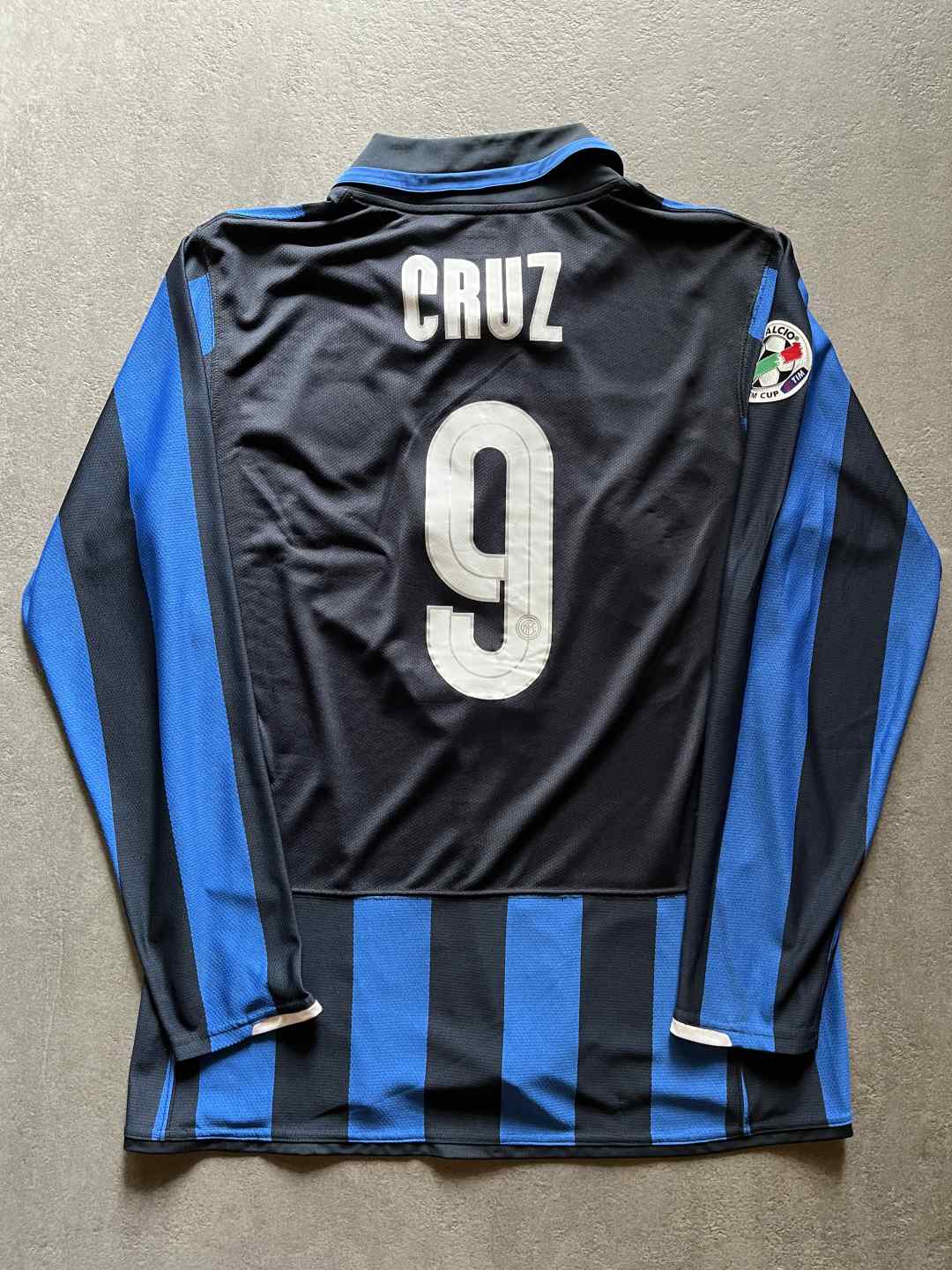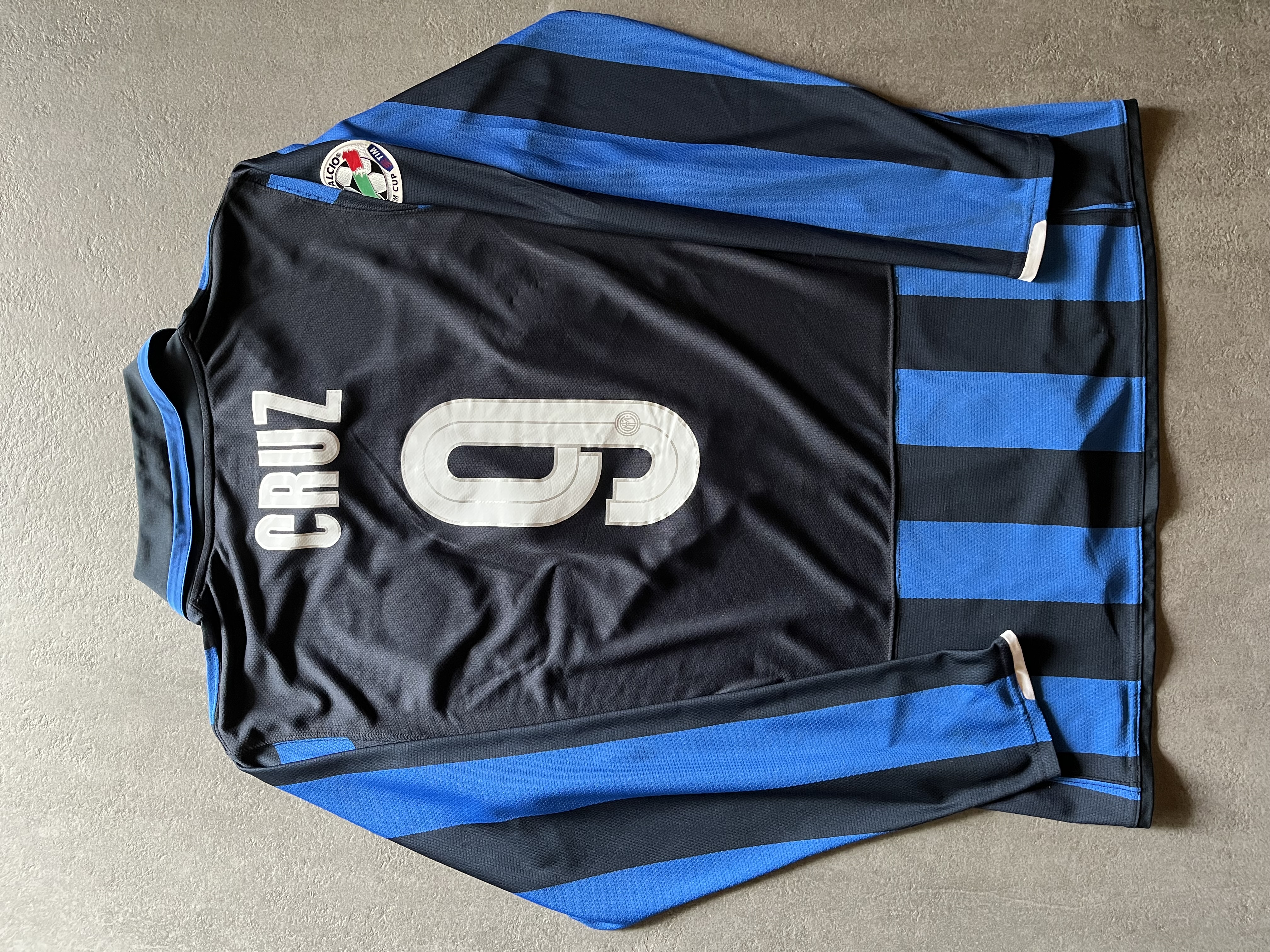 Descrizione estesa:Maglia home a manica lunga indossata nel primo tempo di gara dal calciatore Julio Ricardo Cruz. Made in Portugal taglia XL. Nome e numero ufficiale in Player Size Version (a differenza delle repliche i cui materiali sono differenti e più pesanti). Patch Lega Tim CUP termo applicata su manica destra. Scudetto termoapplicato e cucito al petto. ASSENZA dell'etichetta cucita "100 ANNI NERAZZURRO" davanti alla maglia (presente invece nelle repliche), ASSENZA di etichette interne lavaggio cucite ma presente invece una termoapplicata. Retro maglia con sfondo nero mai commercializzata negli store ed utilizzata dalla prima squadra solamente nelle gare di TIM CUP e Champions League. ASSENZA del logo crociato 1908-2008 dietro al colletto. Maglia mai commercializzata con queste caratteristiche.